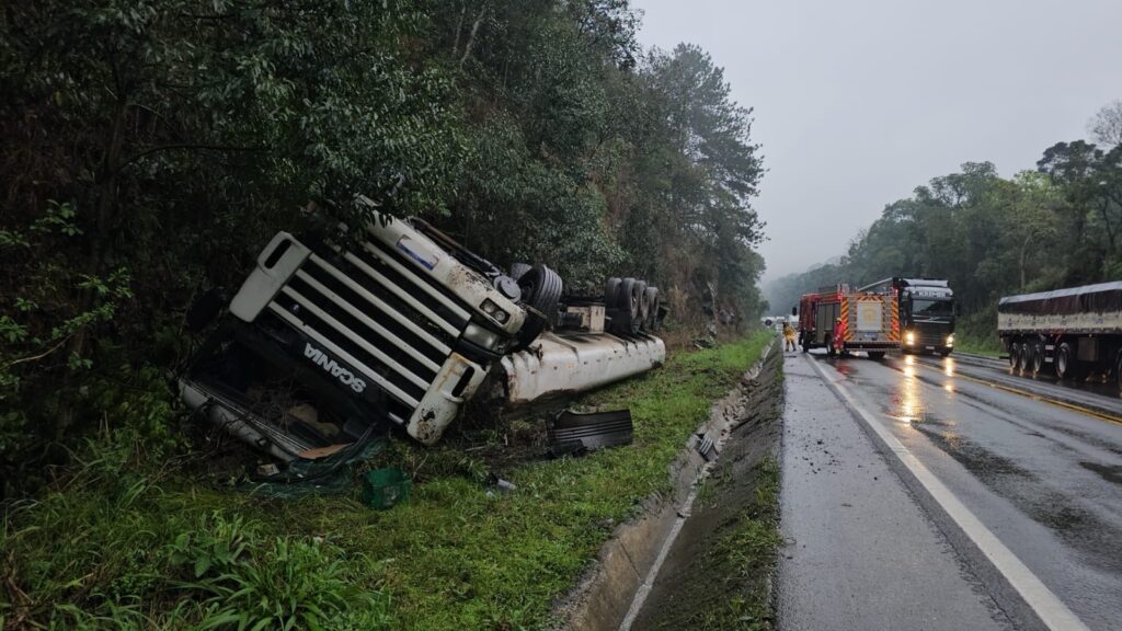 Caminhão tomba na BR-153 em União da Vitória; motorista sofre ferimentos leves