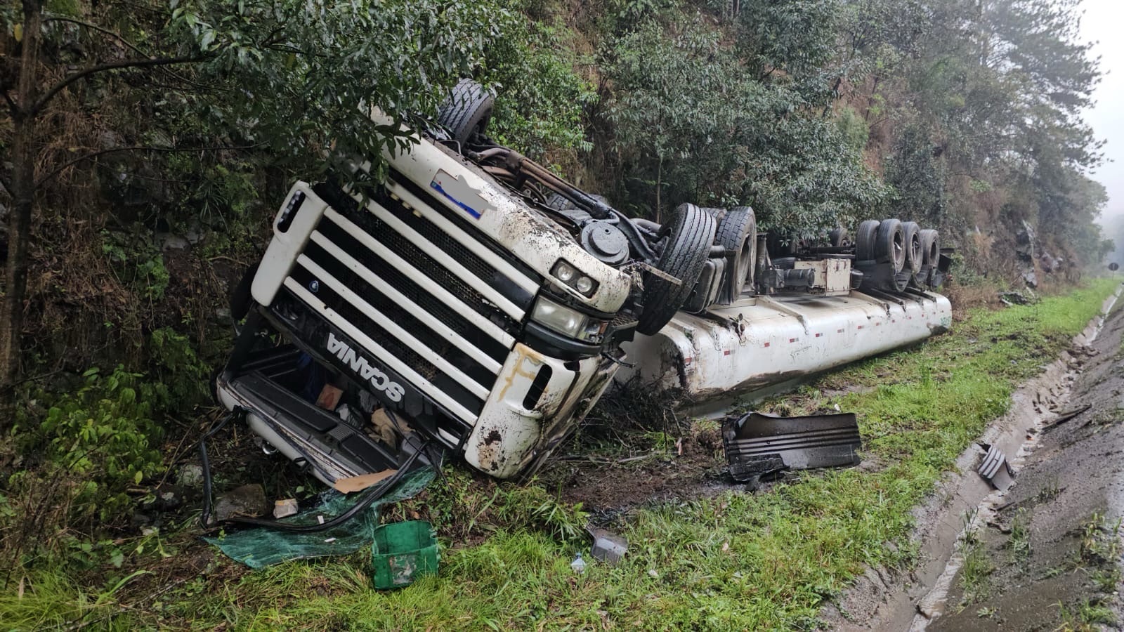 No local, foi constatado o tombamento de um caminhão Scania com placas de Clevelândia/PR, que transportava óleo vegetal.