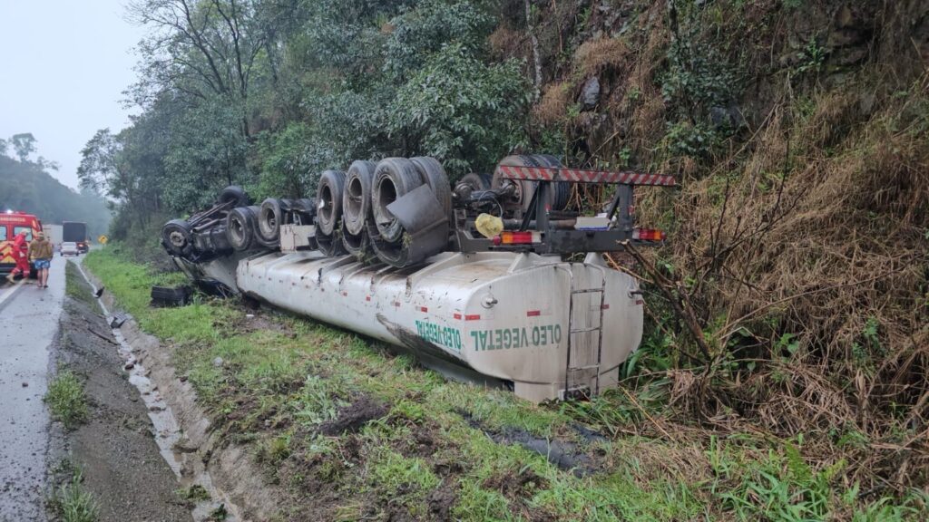 Caminhão carregado com óleo vegetal tomba na BR-153 em União da Vitória