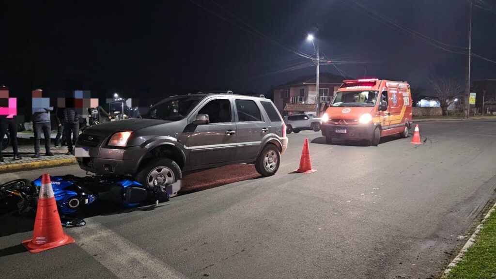 A colisão envolveu um veículo Ford EcoSport cinza, com placas de Porto União, e uma motocicleta Suzuki GSX 750 azul, emplacada em Mallet.