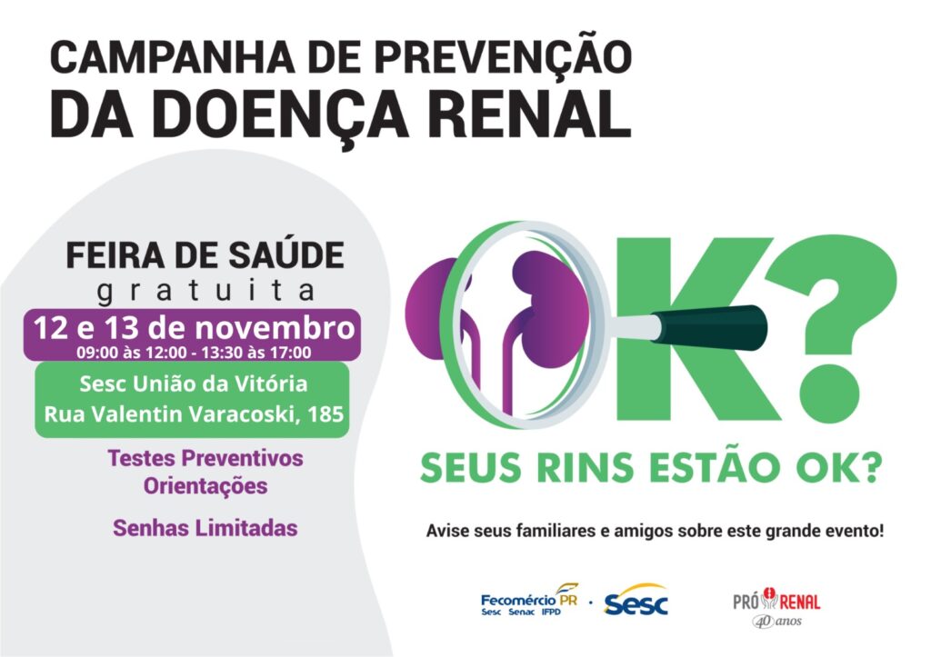 O Sesc União da Vitória, em parceria com a Fundação Pró-Renal de Curitiba, promove nos dias 12 e 13 de novembro uma Ação de Prevenção às Doenças Renais, aberta a toda a comunidade e com atendimento gratuito.