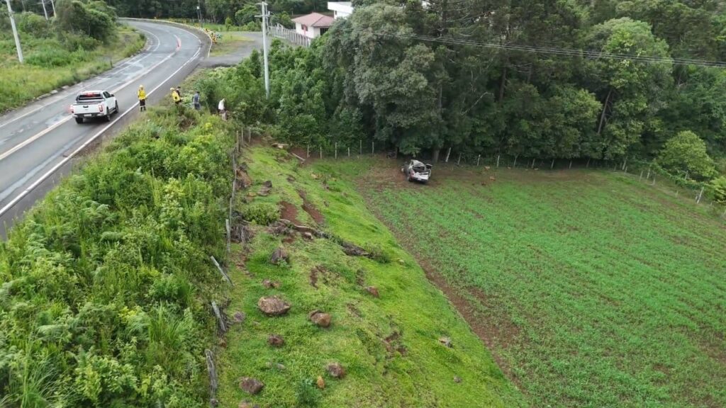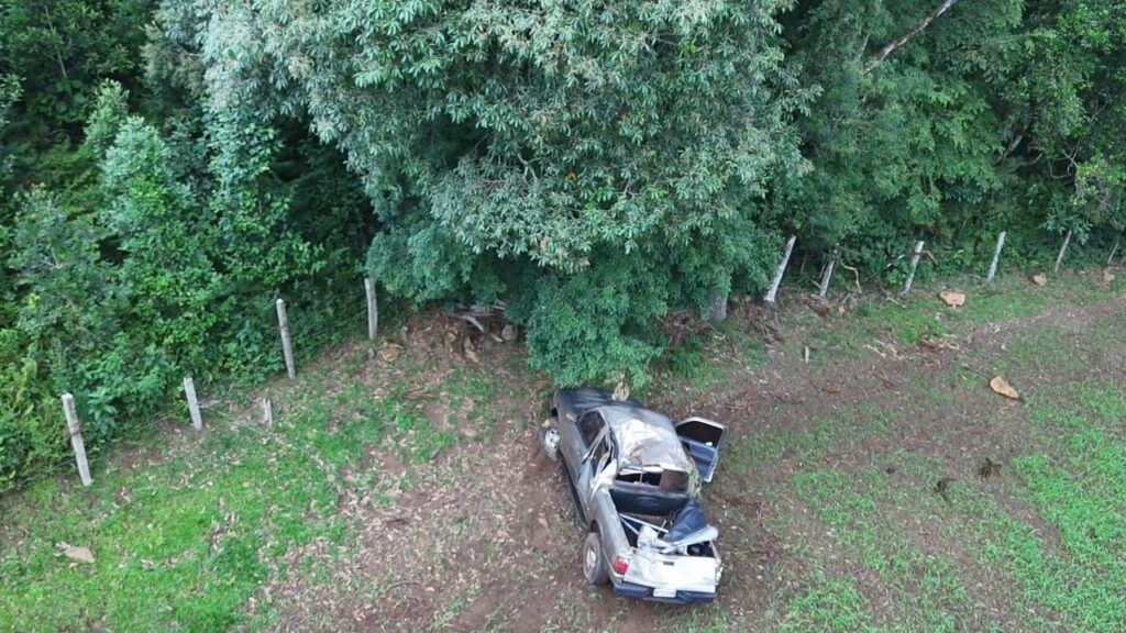 No local, os socorristas encontraram uma caminhonete Ford Ranger, com placas de Caçador, que saiu da pista, capotou e despencou em um barranco com cerca de 20 metros de altura. No veículo estavam três ocupantes: o motorista, que sofreu apenas escoriações leves, além de uma mulher e um jovem, ambos com ferimentos considerados leves.