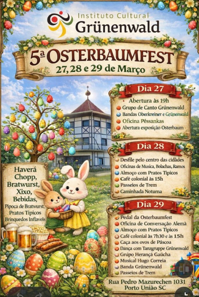 Porto União recebe, entre os dias 27 e 29 de março, a 5ª edição do Osterbaumfest, evento promovido pelo Instituto Cultural Grünenwald e que já se consolidou como uma das principais celebrações culturais da região neste período que antecede a Páscoa.