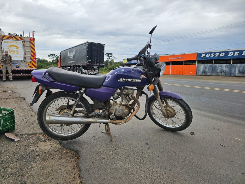 No local, foi constatada uma colisão envolvendo um caminhão e uma motocicleta. De acordo com informações repassadas pelo caminhoneiro, ele seguia pela rodovia quando a motocicleta teria acessado a pista sem aguardar a passagem do veículo. Ainda segundo o relato, o motorista tentou desviar para evitar a colisão direta, porém o rodado do caminhão acabou atingindo o motociclista.